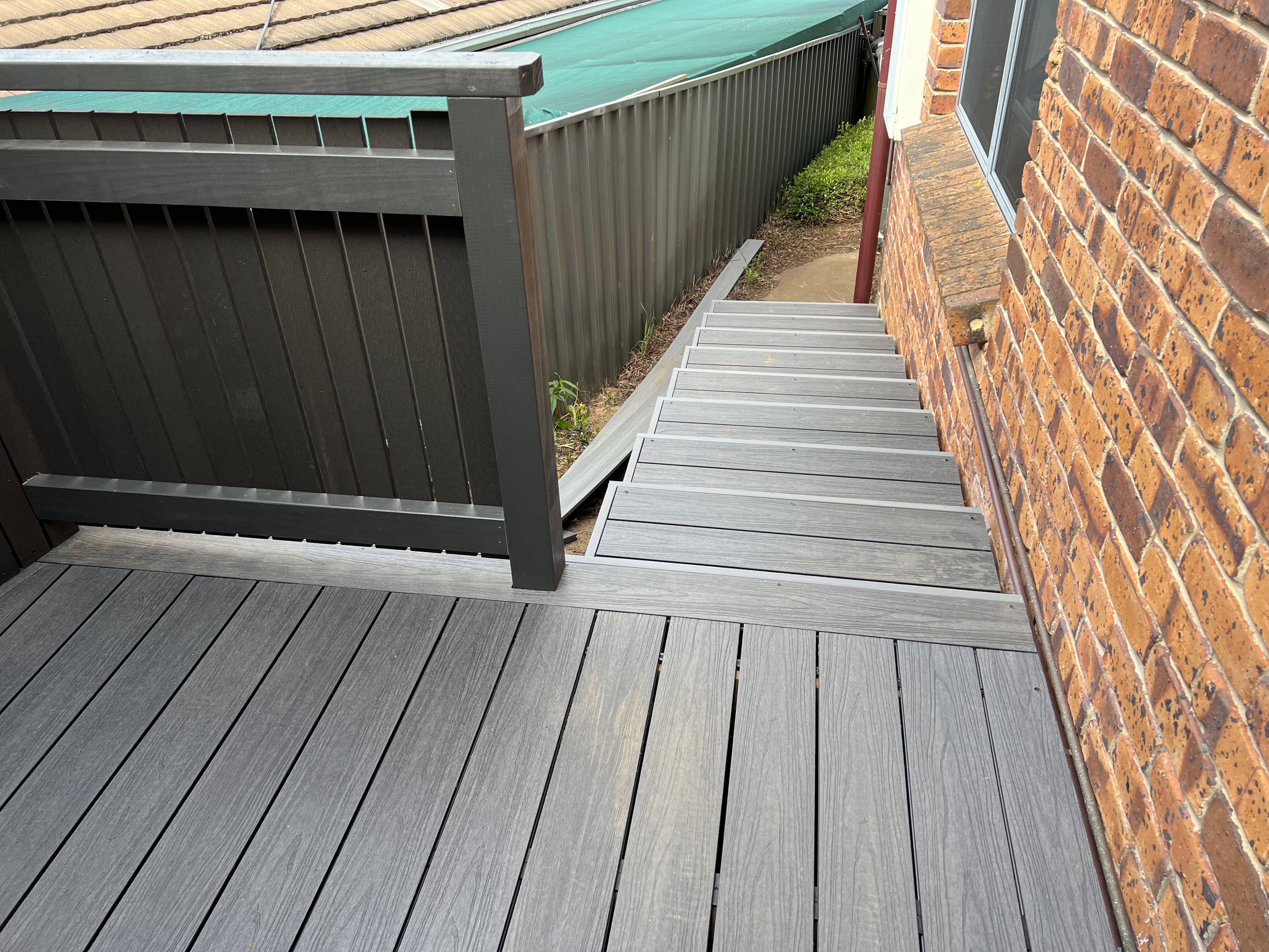 Ekodeck composite decking is the ideal product for this type of stairs. It does not split, rot or cup. It is a stable product that has a long life and requires no maintenance. All Decked Out are preferred installers for Ekodeck.